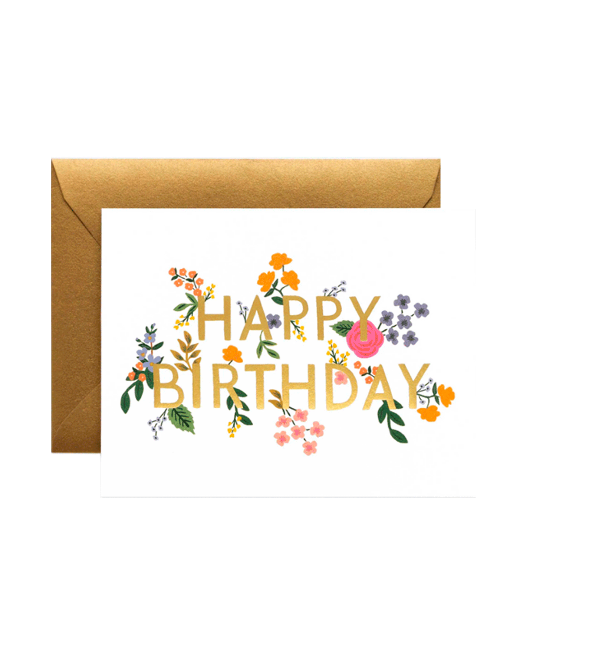Tarjeta de felicitación de cumpleaños de Rifle Paper & Co. Incluye sobre dorado.