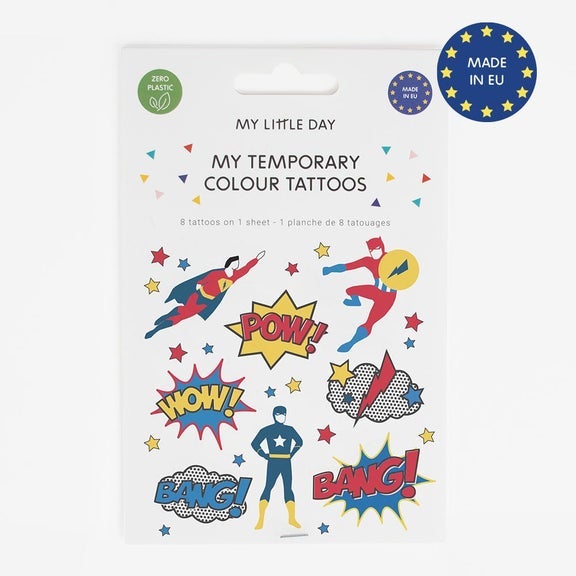 Pack: 1 hojas de tatuajes temporales con diferentes diseños de superhéroe