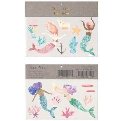 Estos magníficos tatuajes son ideales para agregar un toque de magia extra a tu fiesta. Repleto de ilustraciones de elementos marinos y sirenas en tonos pastel.