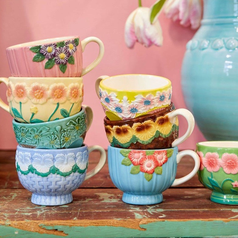 Divertida y colorida taza de cerámica en color rosa con flores lilas, hechas a mano e inspiradas en macetas vintage. Conseguirá un toque único y muy especial en tu cocina. Puedes combinar diferentes modelos y estampados para darle un toque muy Kitsch a tu hogar. ¡A nosotras nos encantan!