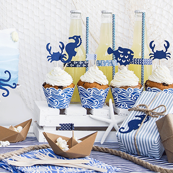 Topper para un pastel muy divertido con velas pirata y tentáculos de pulpo. Conseguirás sorprender a tus invitados y darle el toque a tu mesa dulce con muy poco.