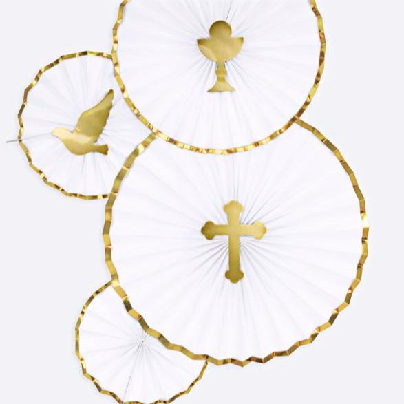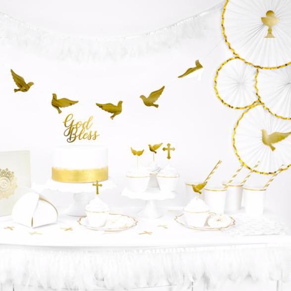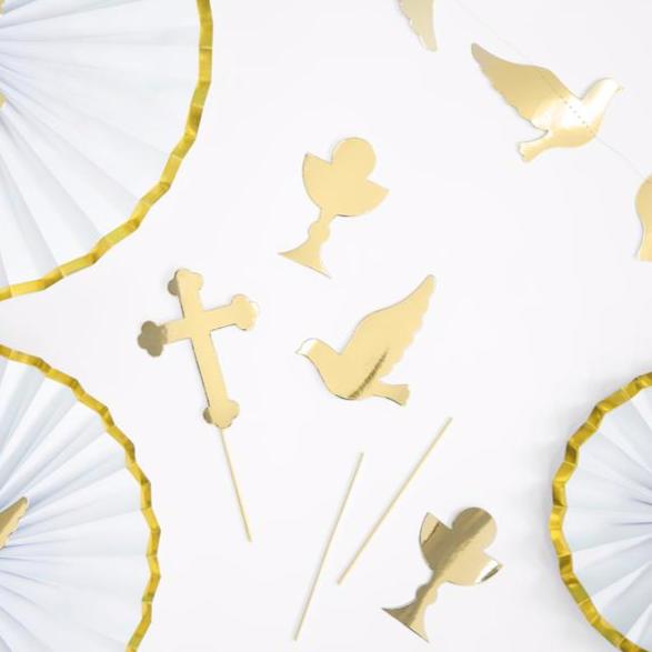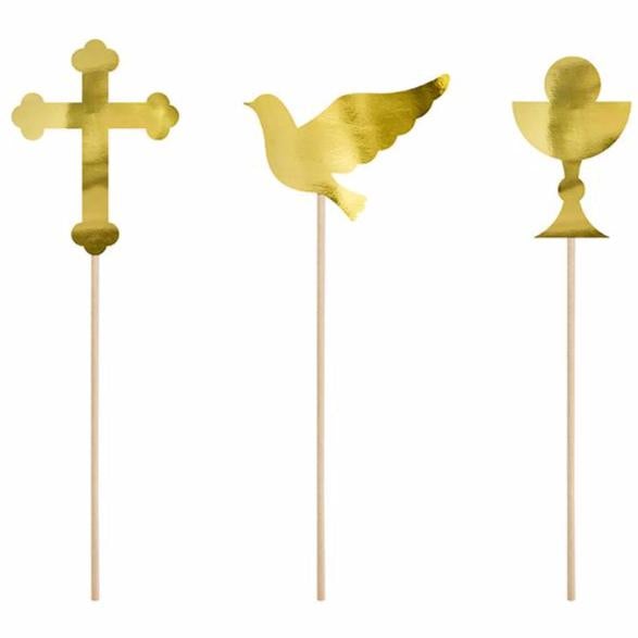 Dale un toque especial a tu pastel, cupcakes o decoración de primera Comunión con estos topares de cáliz, cruz y palomita.