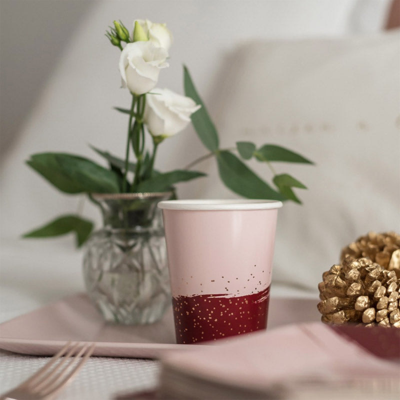 Estos vasos de cartón en color rosa y burdeos con un sutil toque de rose gold, son desechables y 100% biodegradables.