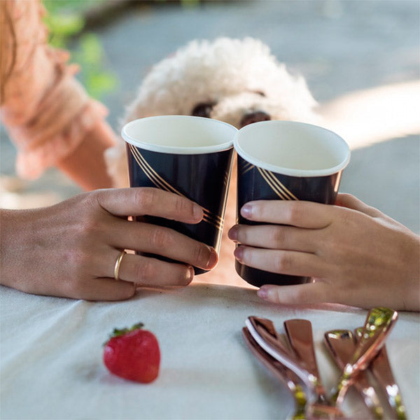 Vasos de cartón en un color azul marino intenso casi negro con decoraciones muy finas en dorado brillo. Una colección muy femenina y con un toque modernista que serán el diseño perfecto para una cena de amigas o una merienda en el jardín.