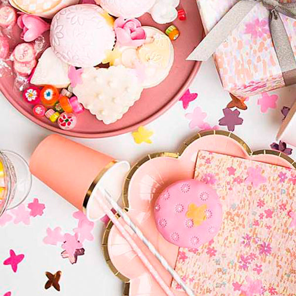 Vasos de cartón en color rosa basicos. Tienen un bonito filo dorado en brillo en la parte de superior que lo hace muy especial.