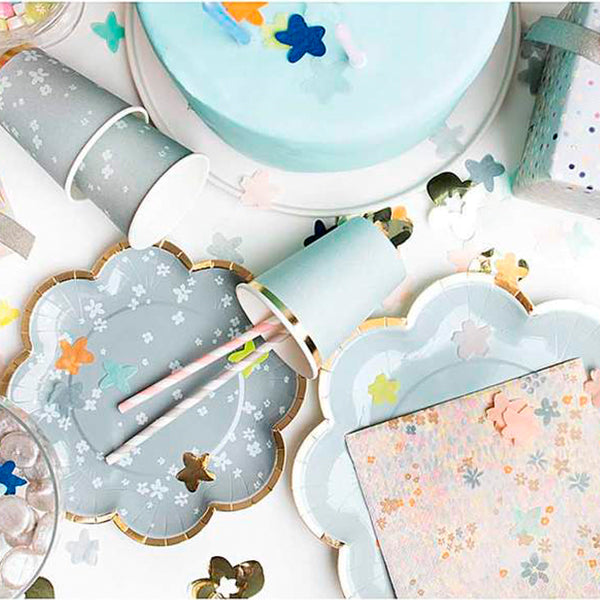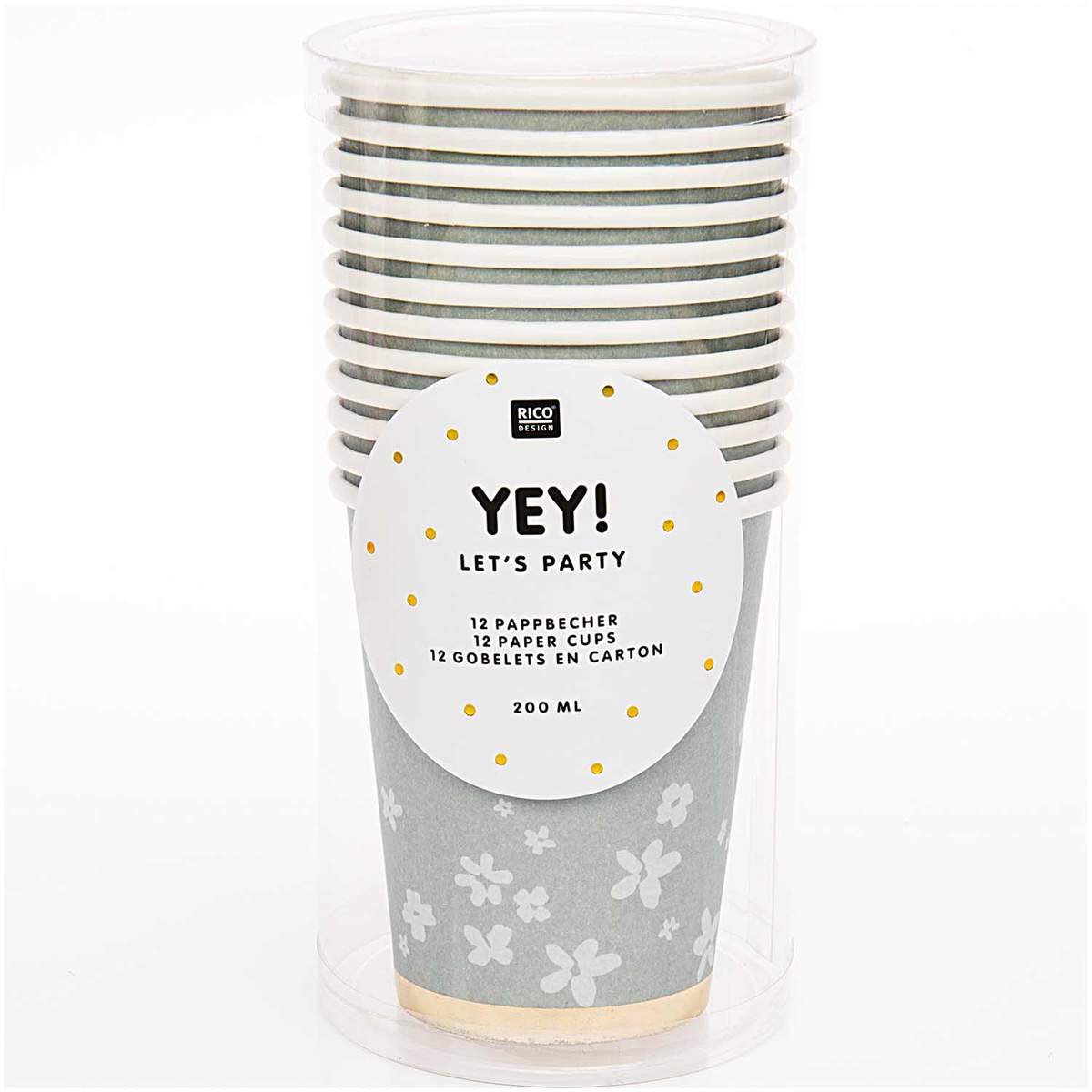 Vasos de cartón en color gris con detalle de flores en color blanco muy sutiles. Tienen un bonito filo dorado en brillo en la parte de baja del vaso que lo hace muy especial.