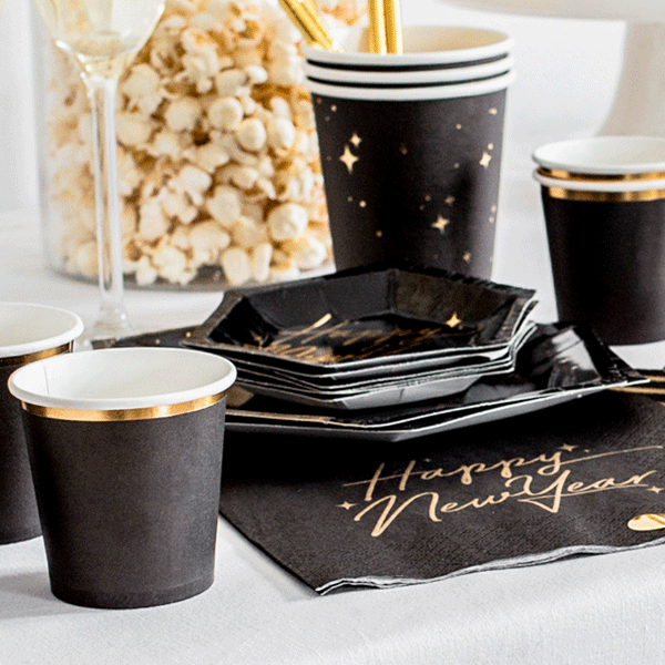 Dale un toque diferente a tu fiesta con estos vasos negros con elegante borde dorado. Puedes hacerlo servir para servir el café o para rellenarlo de palomitas ¡ A nosotras nos encantan!