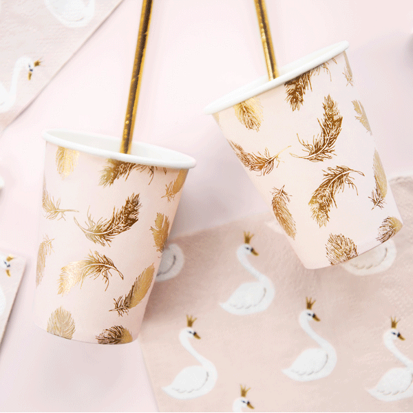 Vasos de cartón en melocotón con plumas doradas. Ideales para una fiesta de bebés. ¡Absolutamente ideales!