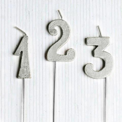 Vela cumpleaños con número en color plateado con palo de madera realizada de forma artesanal de medidas 22,5 cm.