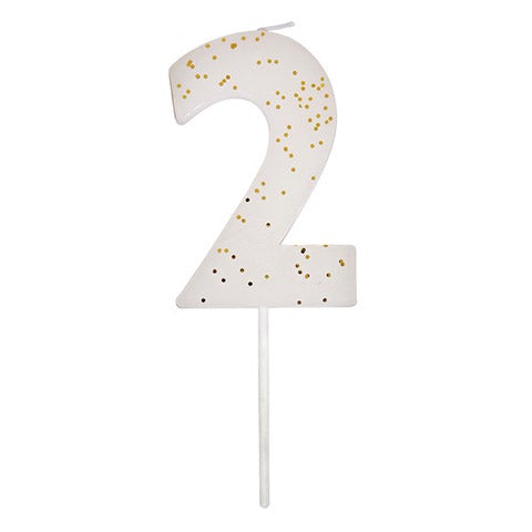 Vela con forma de número y pincho de plástico para clavar en el pastel en color blanco con purpurina en dorado.