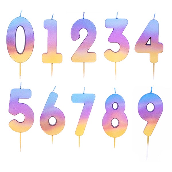 Velas de número en degrade amarillo, lila y azul para adornar el pastel de una manera muy original y única. Dale el toque final a tu fiesta con estas velas tan únicas y especiales.