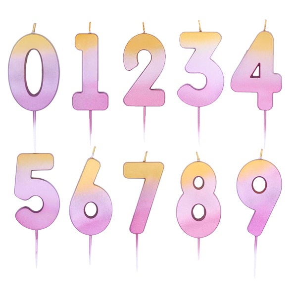 Velas de número en degrade amarillo, lila y rosa para adornar el pastel de una manera muy original y única. Dale el toque final a tu fiesta con estas velas tan únicas y especiales.