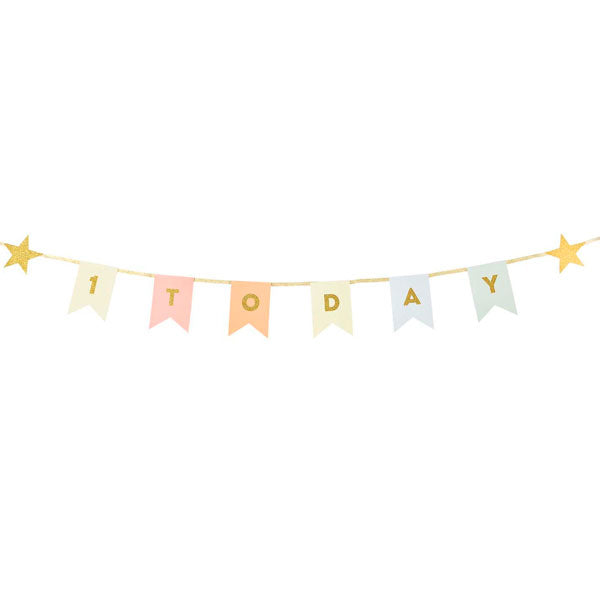 Decora la fiesta de primer año de tu bebé con esta guirnalda ideal con banderines de cartón en mix tonos pastel, con las siglas "One Today" en letras en dorado glitter y estrellas en ambos extremos.