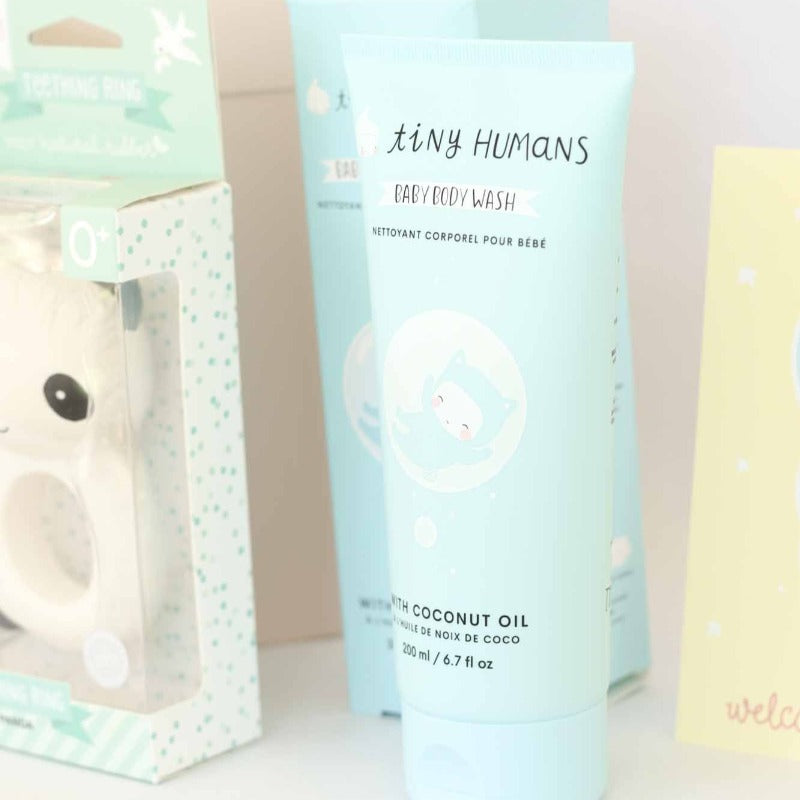 - Un estuche con un kit de gel o loción para piel sensible Tiny Human