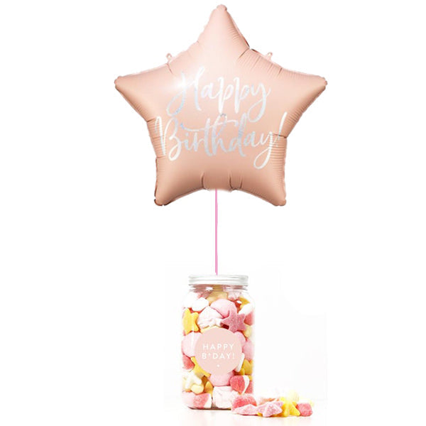 - 1 Globo foil estrella rosa con mensaje "Happy Birthday" de 40 cm. aprox. hinchado con helio profesional y cinta. No incluye peso.