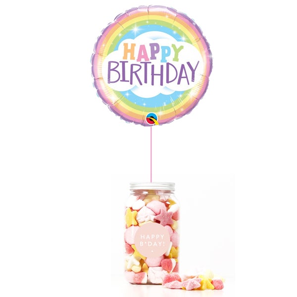 - 1 Globo foil redondo Arcoiris Happy Birthday 40 cm. aprox. hinchados con helio profesional y cinta. No incluye peso.