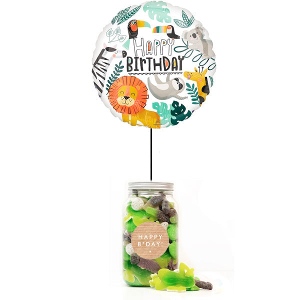 - 1 Globo foil redondo Safari con mensaje "Happy Birthday" de 40 cm. aprox. hinchado con helio profesional y cinta. No incluye peso.